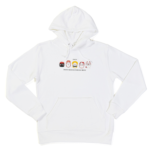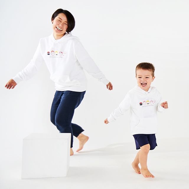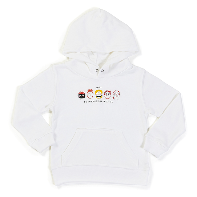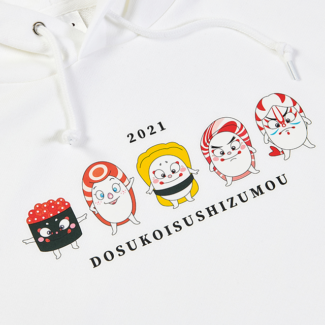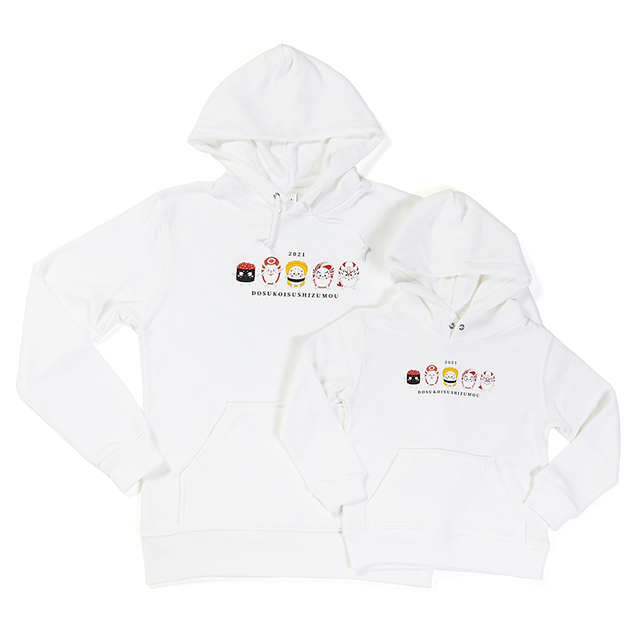 すし力士が5人そろったかわいいプリントのパーカーです。大人サイズ・子どもサイズを取り揃えているので沢山の人にすしずもう力士ファッションをお楽しみいただけます。