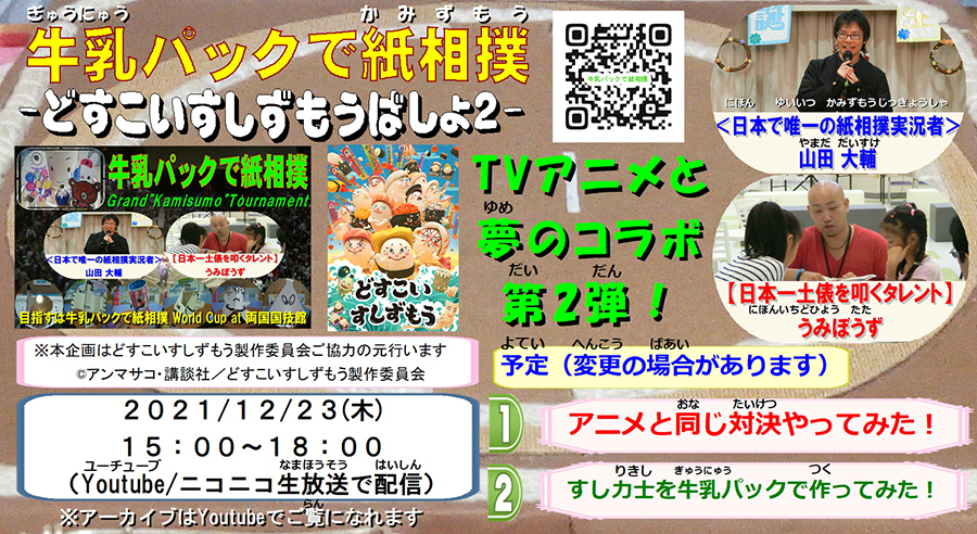 どすこいすしずもうかみずもうBOXを使用し、すし力士カードを使ってアニメで実際に行われた対戦を再現。アニメで負けてしまった力士は紙相撲でリベンジなるか?